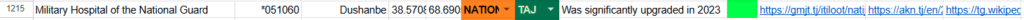 Extracts from the Force Structure dataset displaying a sample row for Tajik unit 051060, including unit name, military unit designation, geospatial coordinates, service branch, geospatial coordinates, and associated OSINT verification links.